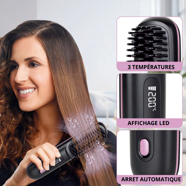 Oubliez les appareils encombrants et les routines interminables. Notre brosse lissante AirLiss™ sans fil compacte et élégante transforme vos cheveux en un instant, que vous soyez à la maison, au bureau ou en voyage. En seulement quelques minutes, vos cheveux sont lisses, brillants et impeccables